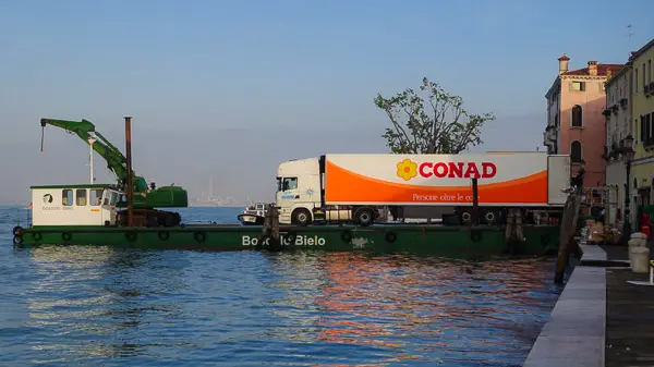 ABOVE: A truck on a barge delivers groceries to the Conad City supermercato on the Fondamenta della Zattere. ![]() ![]()